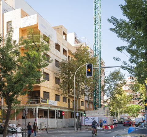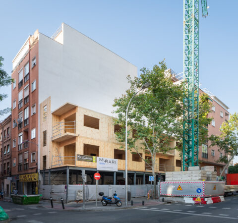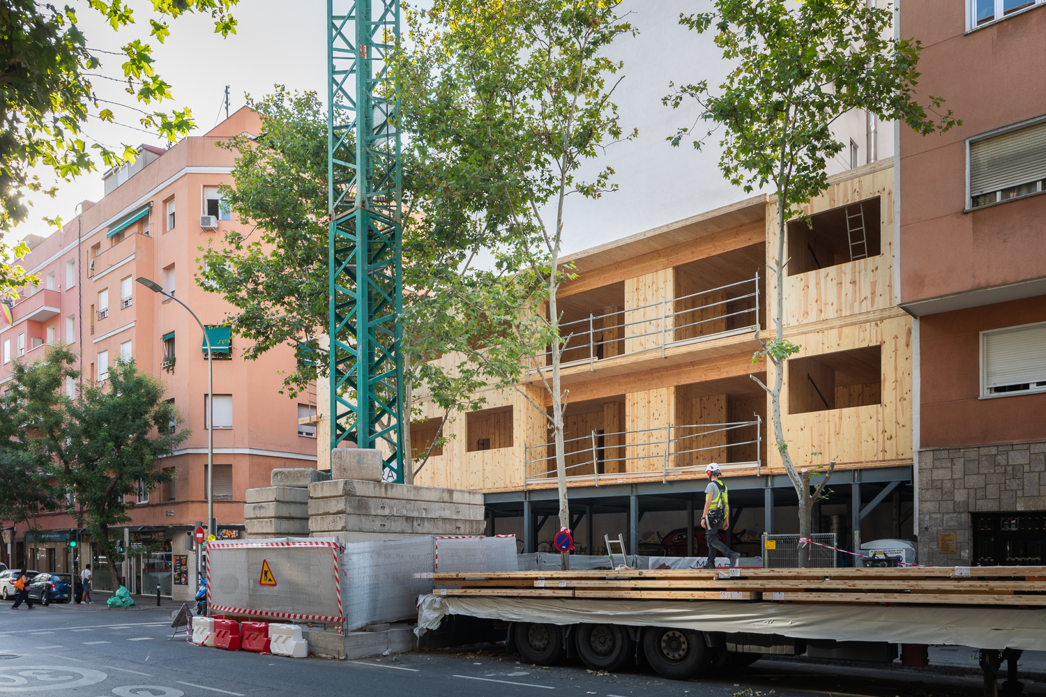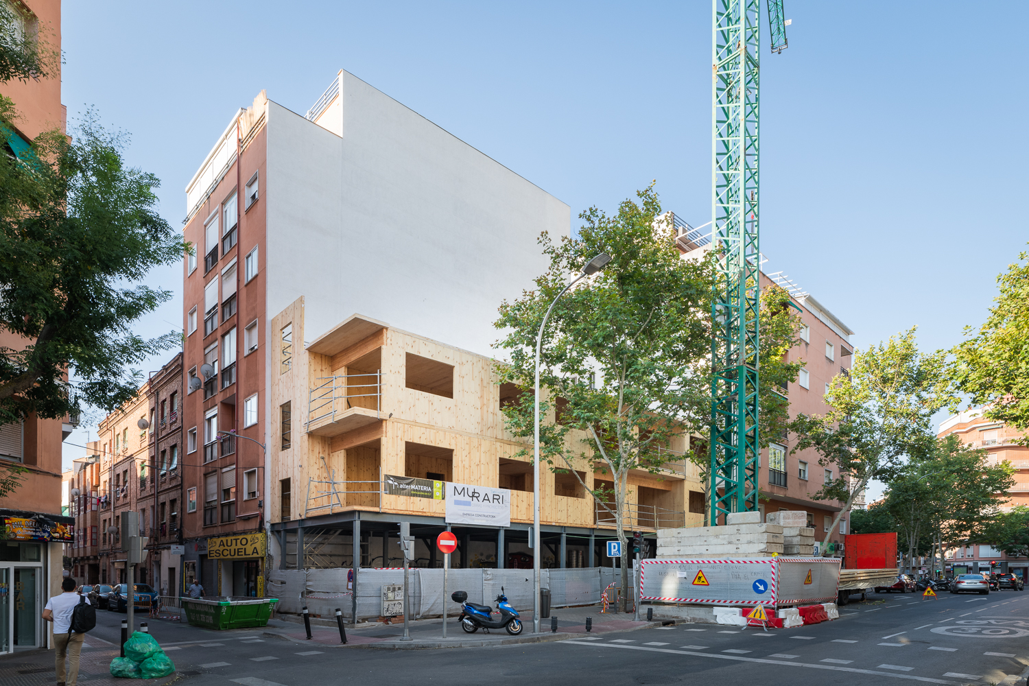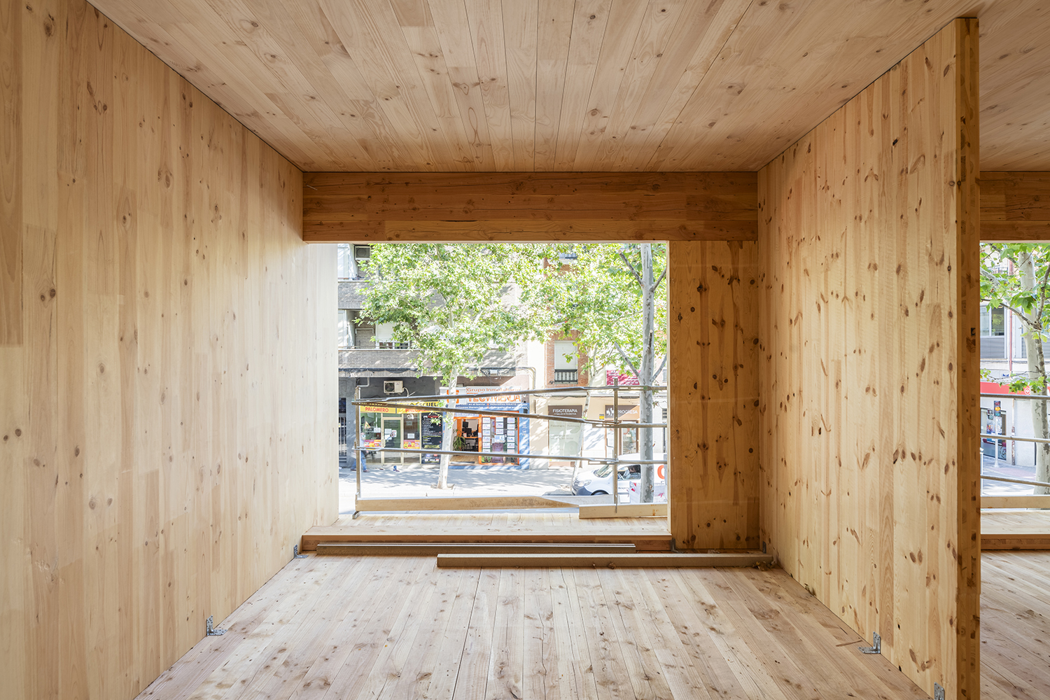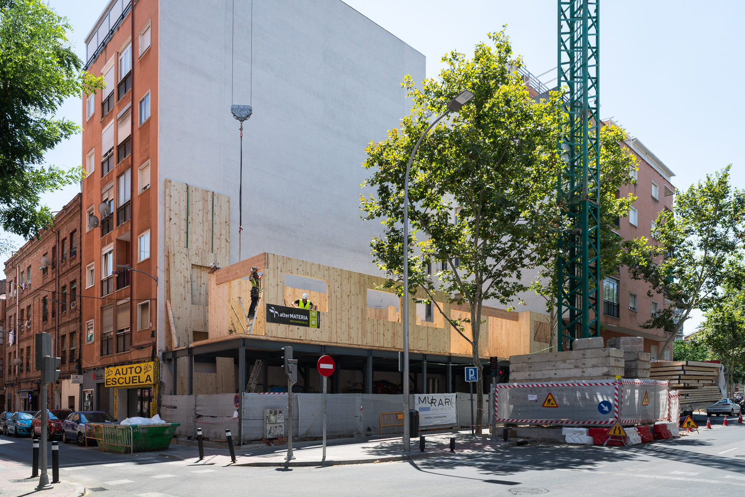 En los próximos meses se perderá ese efecto llamativo de situar un volumen de madera de semejantes proporciones en el centro de un barrio como el de Tetuán. Las fachadas se revestirán con aislante y mortero y su aspecto pasará a ser más convencional dejando únicamente vistos los techos interiores.