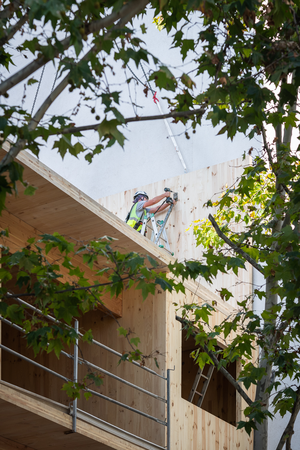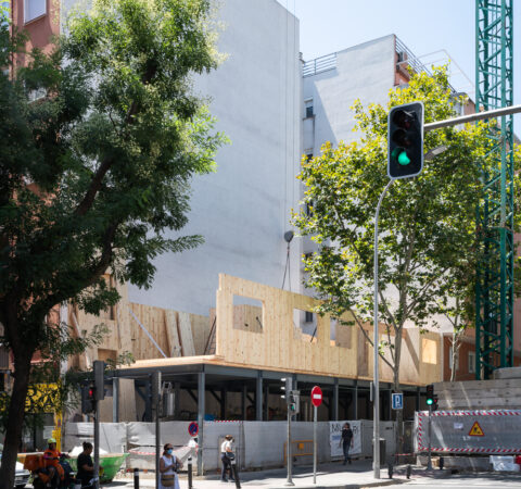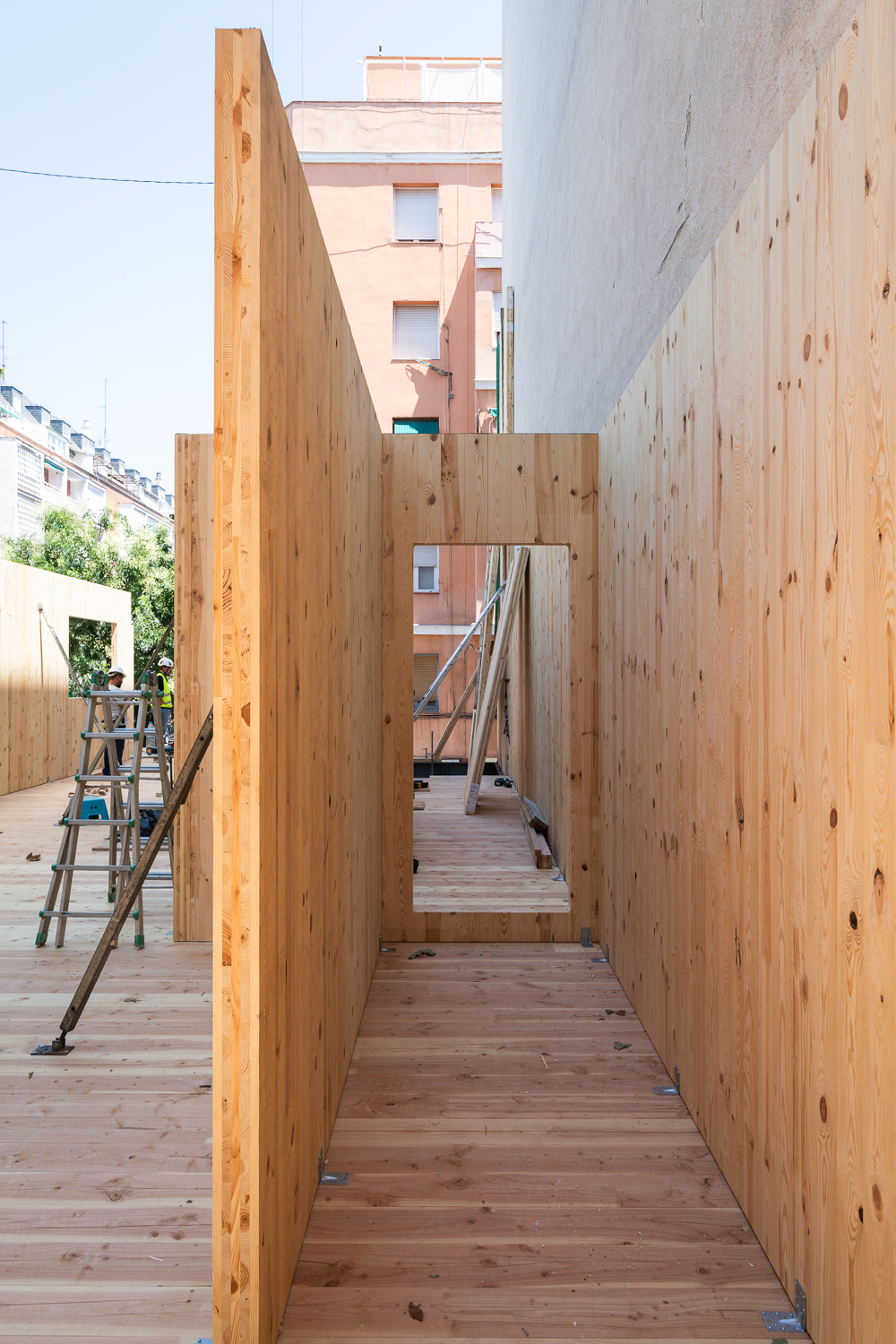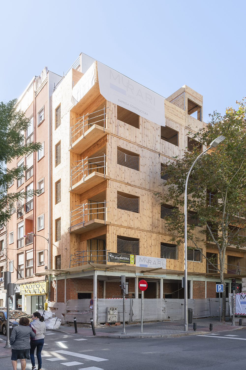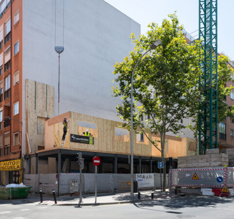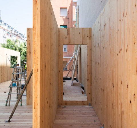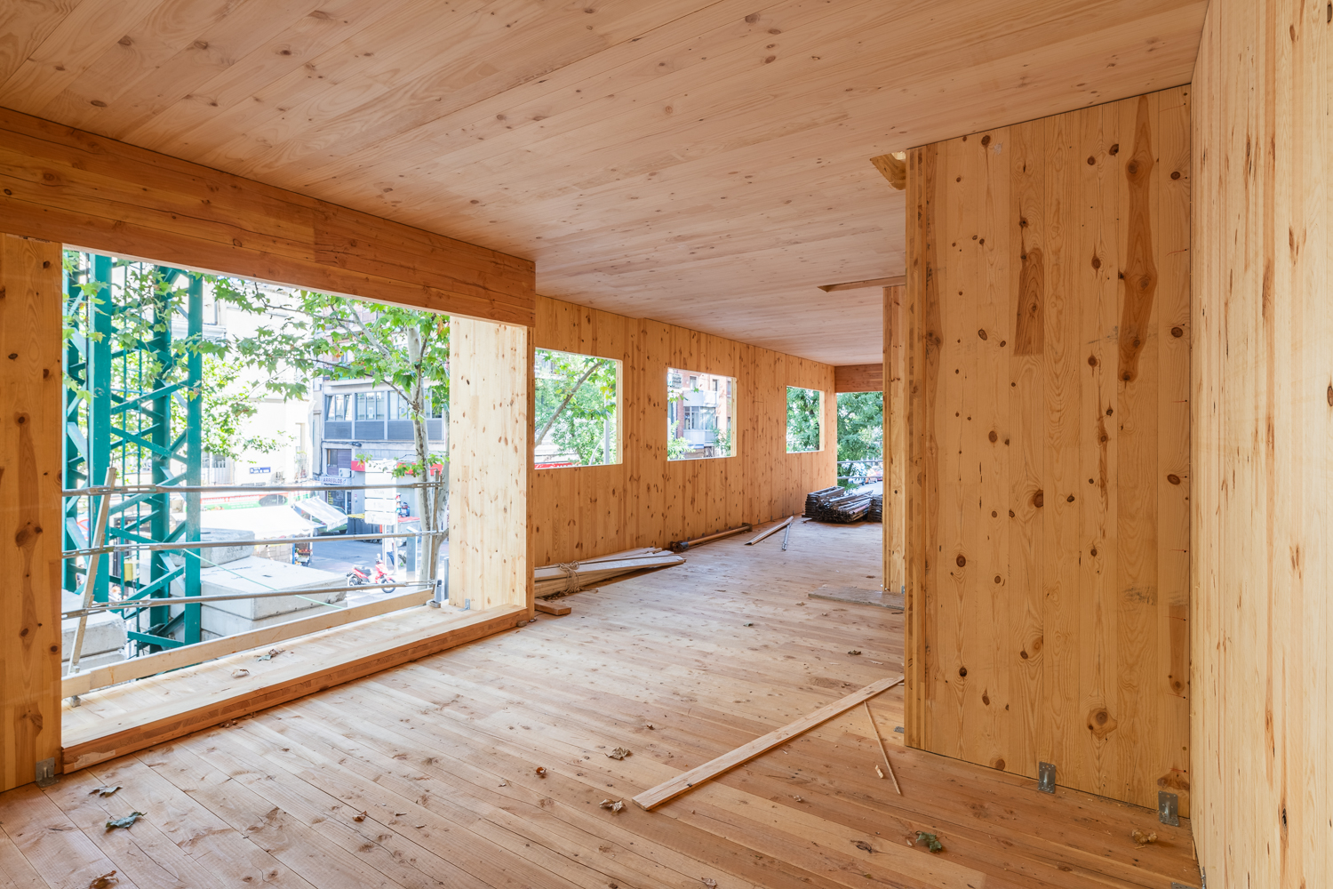 En los próximos meses se perderá ese efecto llamativo de situar un volumen de madera de semejantes proporciones en el centro de un barrio como el de Tetuán. Las fachadas se revestirán con aislante y mortero y su aspecto pasará a ser más convencional dejando únicamente vistos los techos interiores.