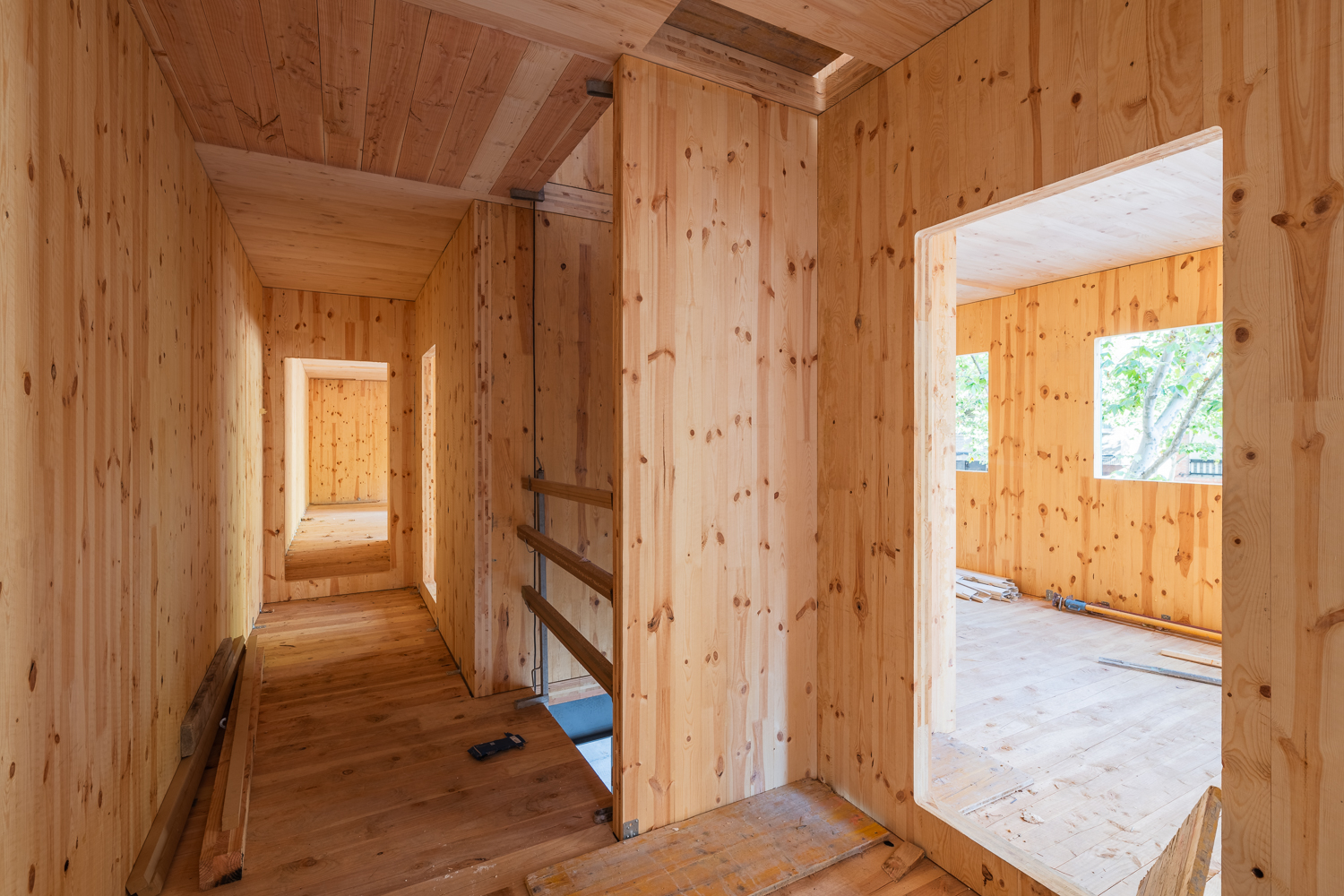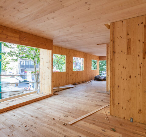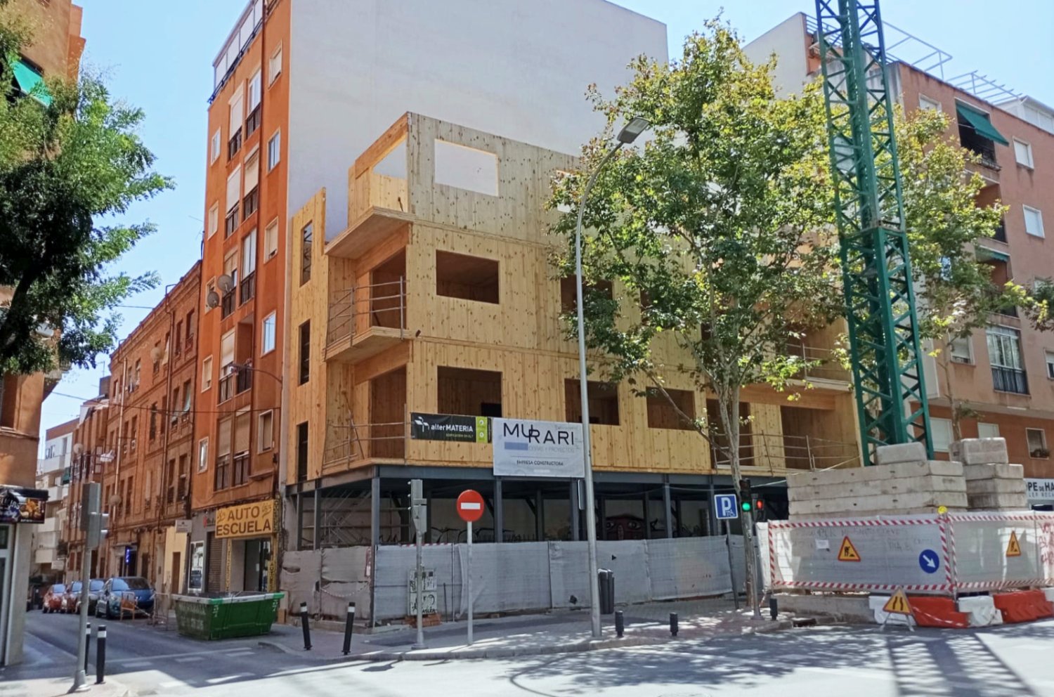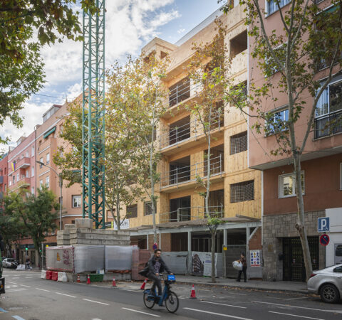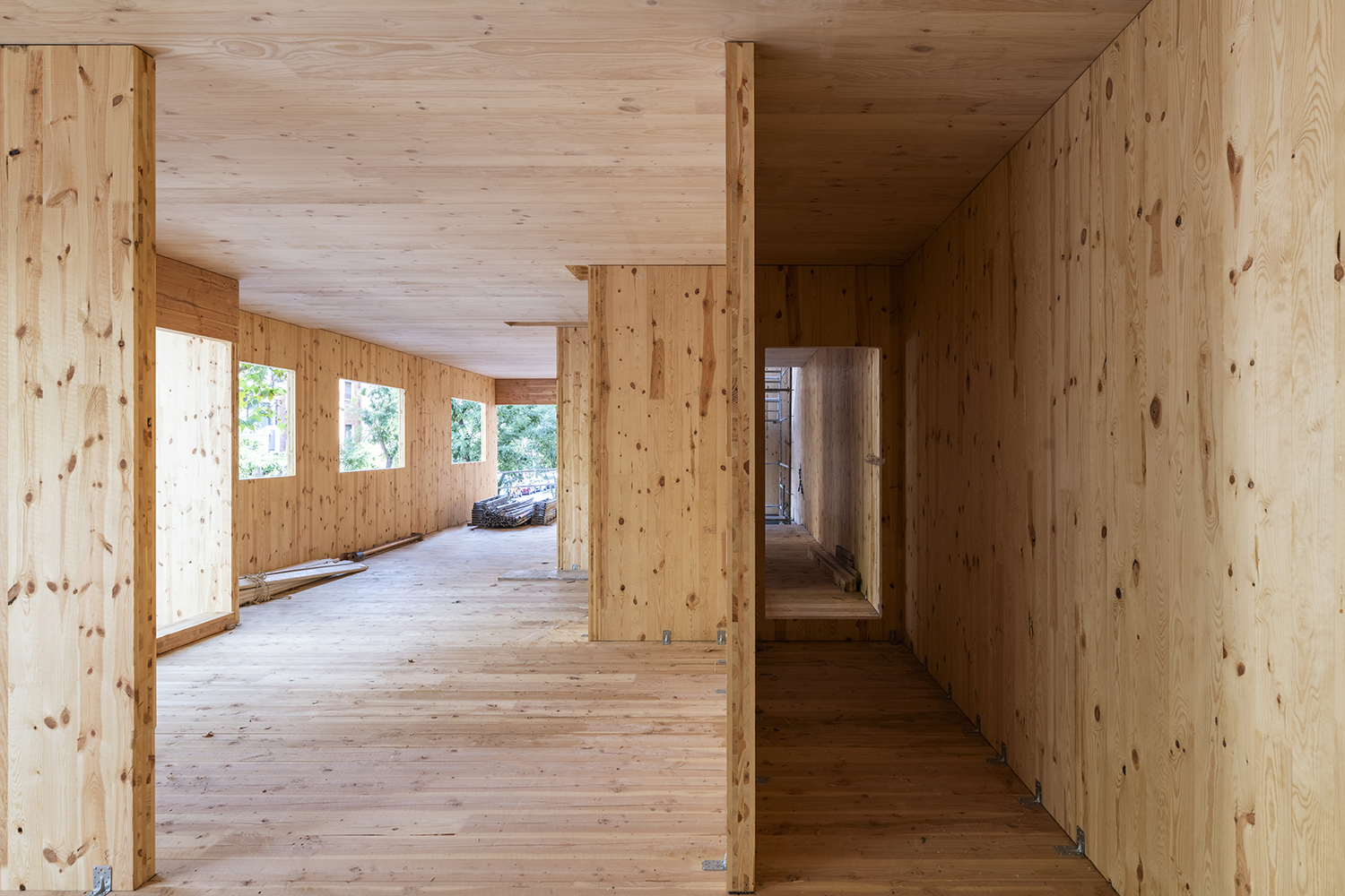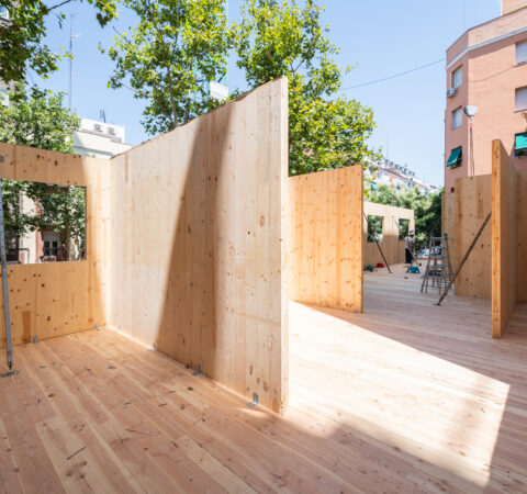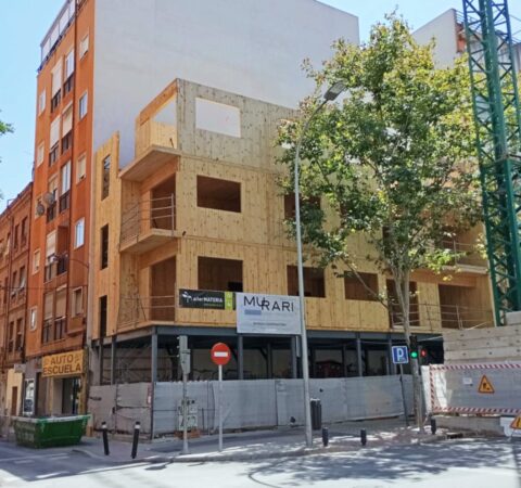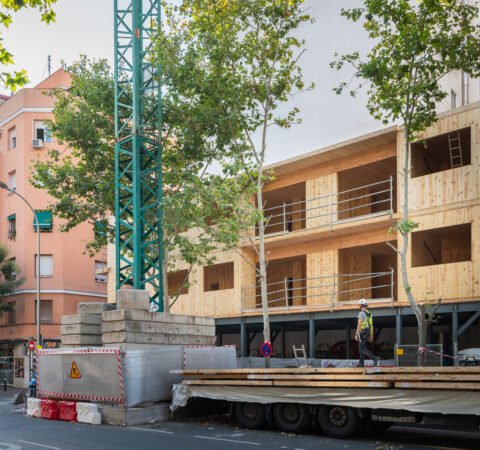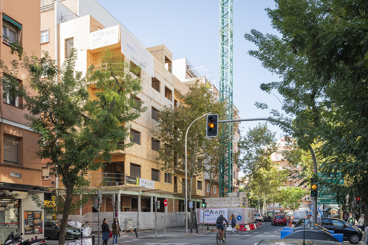 En los próximos meses se perderá ese efecto llamativo de situar un volumen de madera de semejantes proporciones en el centro de un barrio como el de Tetuán. Las fachadas se revestirán con aislante y mortero y su aspecto pasará a ser más convencional dejando únicamente vistos los techos interiores.