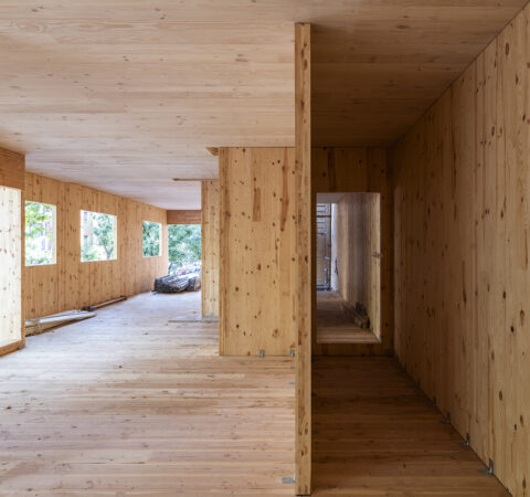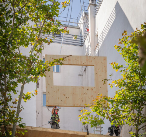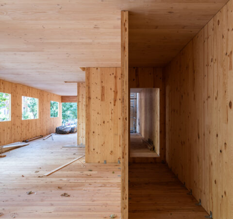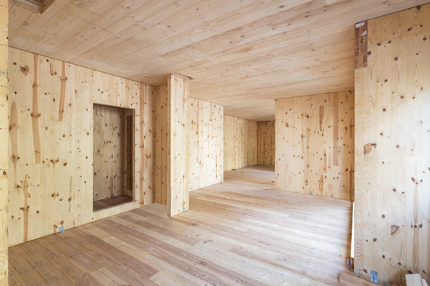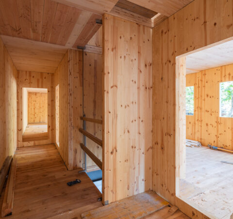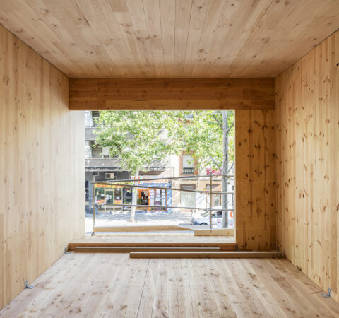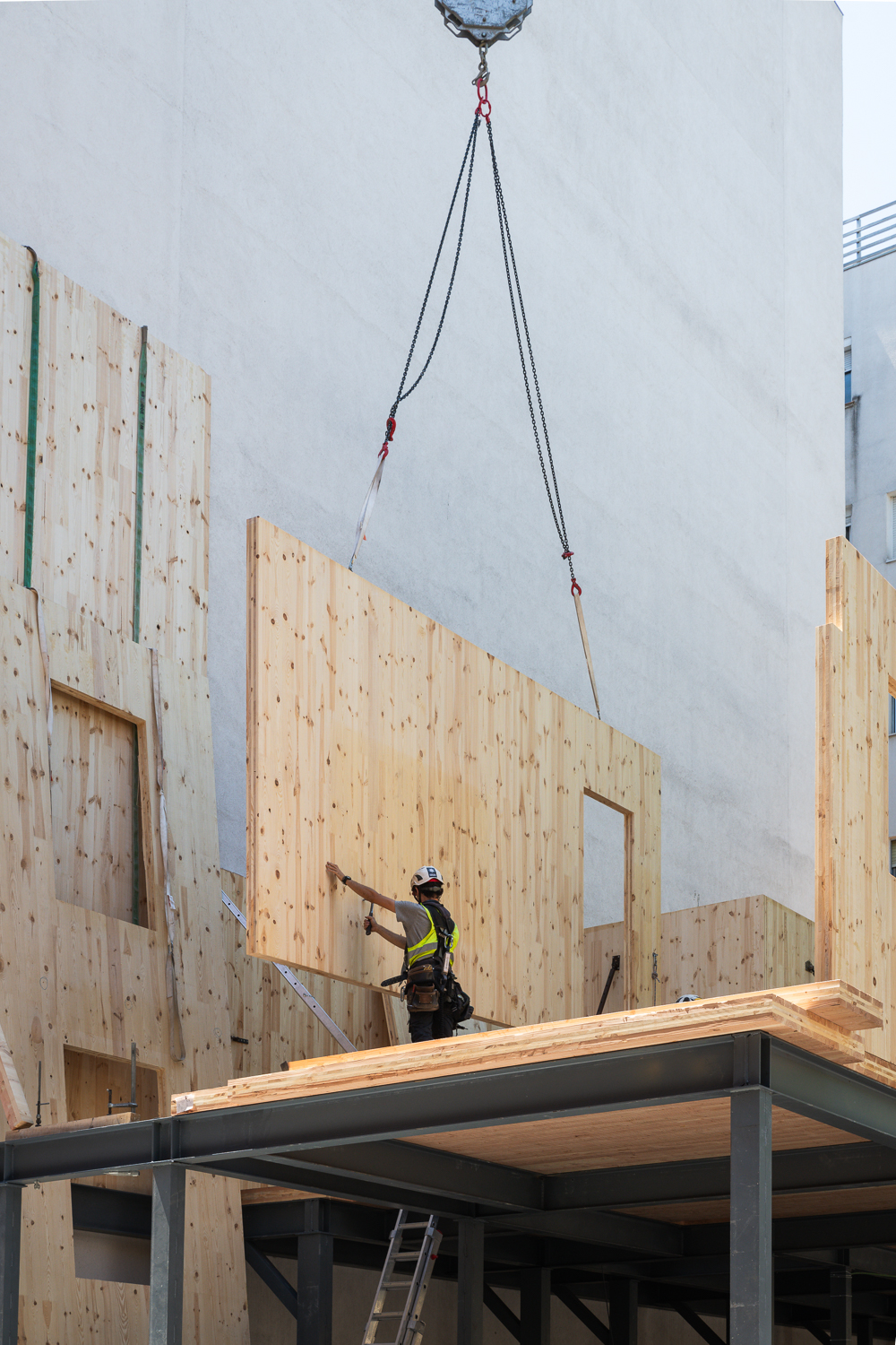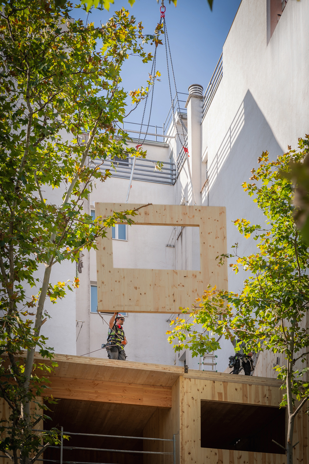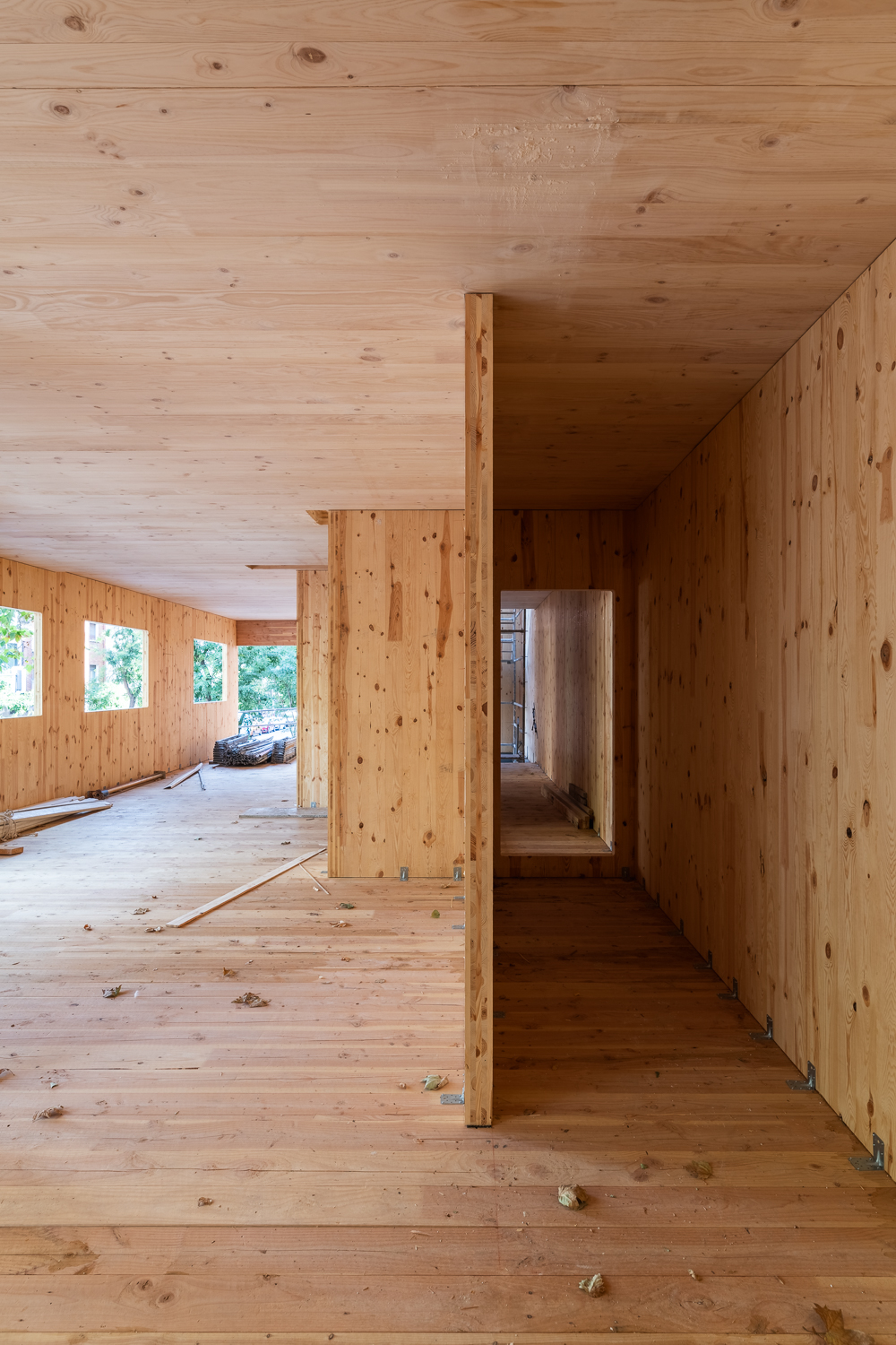 En los próximos meses se perderá ese efecto llamativo de situar un volumen de madera de semejantes proporciones en el centro de un barrio como el de Tetuán. Las fachadas se revestirán con aislante y mortero y su aspecto pasará a ser más convencional dejando únicamente vistos los techos interiores.