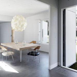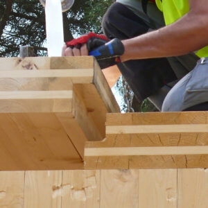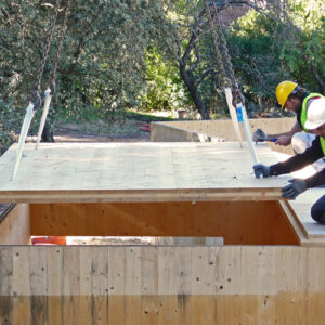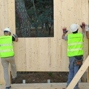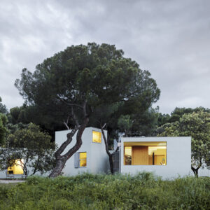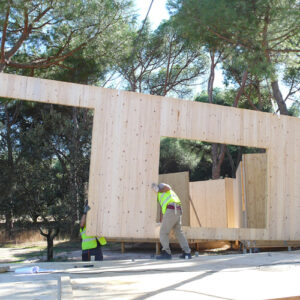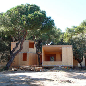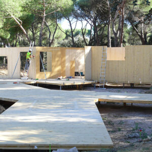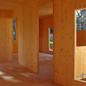 Se trata de una vivienda unifamiliar con forjado de CLT atornillado a pilotes metálicos roscados en el terreno. El forjado serpentea esquivando el arbolado de la parcela y generando una plantilla exacta sobre la que montar los muros perimetrales.