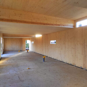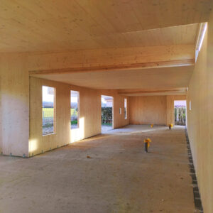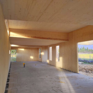 El interior, acabado totalmente en panel contralaminado visto en abeto, consiste en un espacio prácticamente diáfano, en el que posteriormente se colocará tabiquería ligera definiendo las distintas estancias.