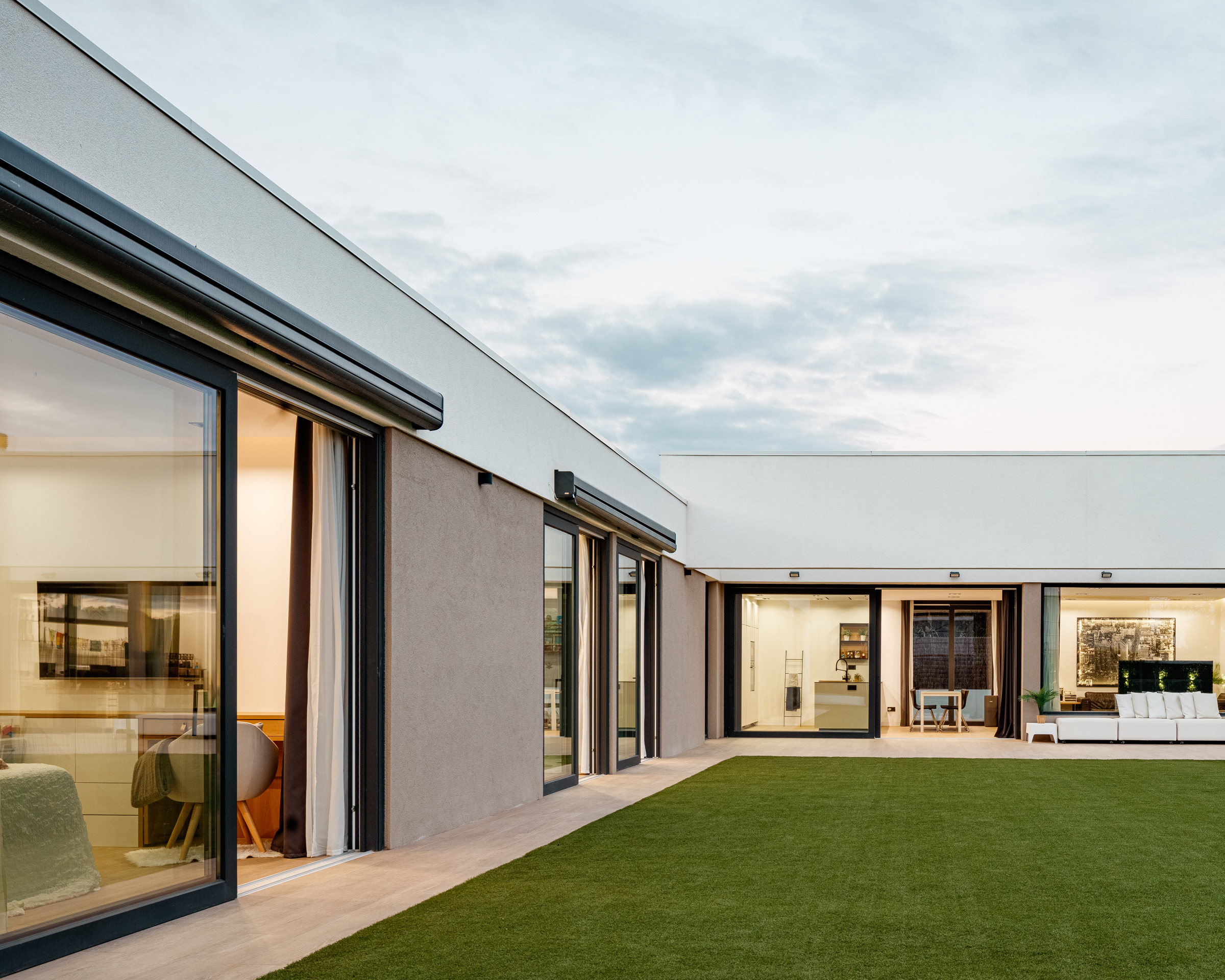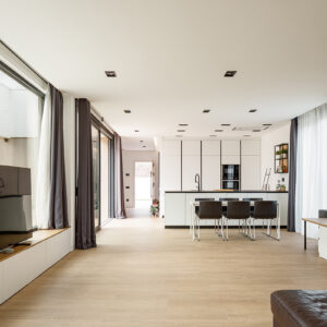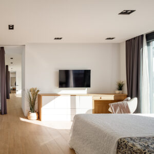 A pesar de que la estructura de madera contralaminada ha quedado totalmente oculta por el mobiliario y los paneles de yeso del revestimiento, es apreciable la ausencia de vigas, mochetas y nervaduras que condicionan la sensación de confort interior.