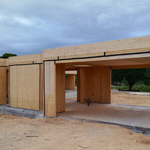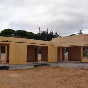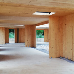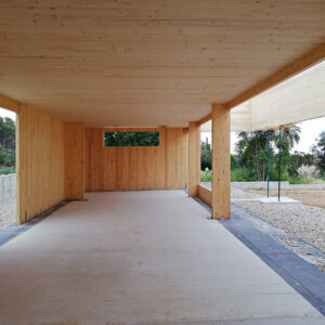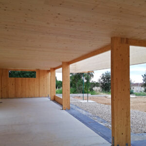Los petos de cubierta, realizados íntegramente en panel CLT, funcionan como jácenas de cuelgue en los tramos donde los grandes huecos de fachada lo requieren.